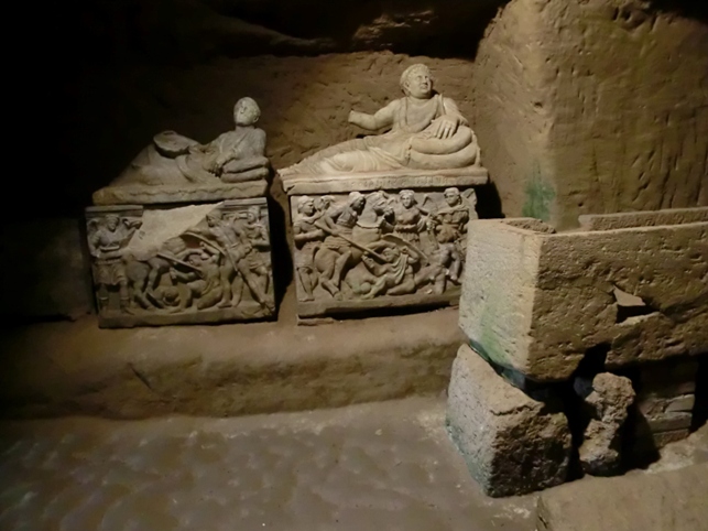 All’interno della tomba furono rinvenuti sarcofagi (5) ed urne (12) in alabastro e travertino relativi a diciassette deposizioni appartenenti in prevalenza alla famiglia Sentinate (10) che utilizzarono l’ipogeo per quattro generazioni. Le urne ritrovate presentavano varie raffigurazioni sulla casse: fascia rossa, rosetta tra due scudi, figura seduta che suona la lira e guerrieri, scena di guerrieri/combattenti, l’indovino Cacu, il saccheggio del Santuario di Delfi.