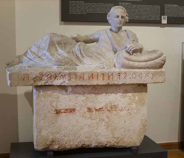 chiusiL’urna di Larth Sentinate Caesa si può invece ammirare al Museo Archeologico Nazionale di Chiusi: il recumbente è semidisteso sulla klinai, appoggia il braccio sinistro su un doppio cuscino, ha un grosso anello al dito della mano sinistra, una lunga ghirlanda gli pende dal collo ed ha il corpo avvolto dalla vita in giù in un abito di lino.