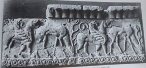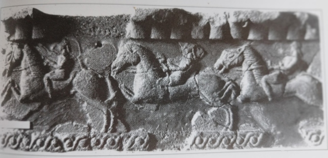 Al periodo tra la fine del VII e l’inizio del VI secolo a.C. appartengono due tipologie di fregi costituiti, rispettivamente, da (a) cervi pascenti e grifi con le fauci spalancate alternati rivolti verso destra e (b) corsa di cavalieri verso sinistra. Gli ulteriori fregi (c) con cortei di biga ed opliti (composti da una biga preceduta da tre armati e seguita da un quarto; sul carro vi sono l’auriga ed un guerriero) articolati in due serie analoghe ma contrapposte e (d) scena (mitologica ?) con una figura maschile ed almeno tre figure femminili in fuga, forse riferibile al mito di Peleo e Teti (madre di Achille), sono attribuibili alla prima metà del VI secolo a.C.