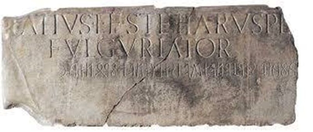 Per completezza è da segnalare che grazie al testo di una bilingue latino etrusca di Pesaro – “Laris Cafatius Larisis Filius Stellatina haruspe(x) fulguriator” = Laris Cafatio figlio di Laris della (tribù) Stellatina aruspice/interprete dei fulmini); “Cafates netśvis trutnvt frontac” = (Laris Cafatio (figlio) di laris aruspice e interprete fulgurale -, sappiamo che il nome etrusco del sacerdote che interpretava i fulmini era frontac.