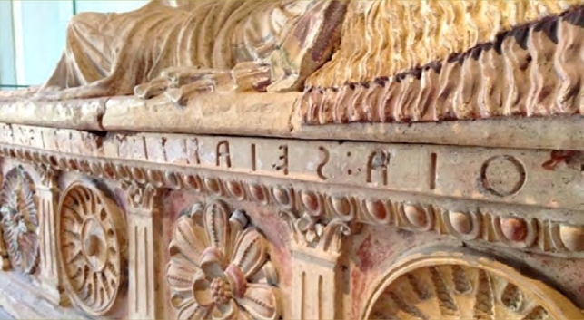 Il nome della nobil donna “larqia: seianti: s… i: sve…” è inciso sulla mensola superiore, ma successivamente è stato coperto con uno strato di stucco che riporta un’iscrizione in rosso appena leggibile “… ti a: lar … lisa: niasa “, probabilmente relativa al riuso del sarcofago da parte di altro membro della famiglia.