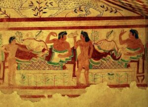 Le donne etrusche dell’alta società – come è attestato dall’iconografia del banchetto – partecipavano distese sui letti conviviali ed al pari dei loro compagni consumavano vino.