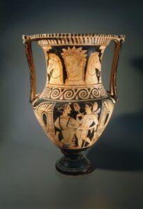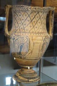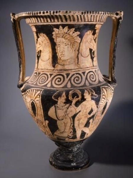 Uno dei crateri presenta sul collo (di entrambe le facce) una faccia girata verso sinistra inquadrata tra due teste equine legate a colonne semi tuscaniche. La faccia di aspetto giovanile è ornata da una corona di foglie di quercia. Sul corpo la decorazione è costituita da una donna (vestita con tunica e mantello) ed un giovane (nudo) una di fronte all’altro. Da un lato la figura maschile stringe con la sinistra un tirso e con la destra alza un ventaglio; sull’altro, l’alto l’uomo offre una corona alla donna. Sotto le anse tre grandi palmette. Il cratere (h. 47,3 cm.; diam. 29,6 cm.) viene attribuito al Pittore di Asciano che lavorava nella bottega del Pittore di Hesione (attiva nella metà del IV secolo a.C.) a Volterra.