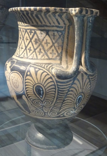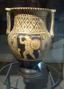 La seconda kelebe ha sul collo motivo a losanghe con crocetta centrale. Sula corpo, da un lato, vi è la raffigurazione di un pigmeo nudo a sinistra che imbraccia uno scudo e stringe nella destra un tirso. Sull’altro lato vi è un pigmeo nudo rivolto a sinistra armato di lancia e di scudo con testa di Acheloo. Sotto le anse tre grandi palmette. Il cratere (h. 31 cm.; diam. 19 cm.) è attribuibile alla Bottega del Pittore di Hesione.