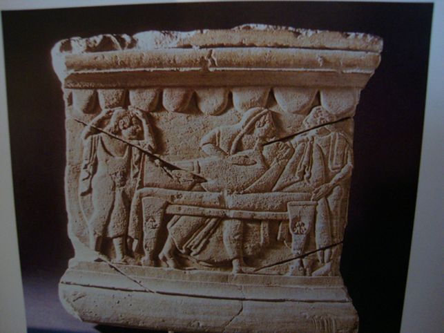 Di seguito immagini di cippi chiusini esposti rispettivamente al Musée du Louvre a Parigi, al Museo Barracco di Roma ed al Museo Civico Archeologico di Sarteano e disegno della Tomba del Morto di Tarquinia.