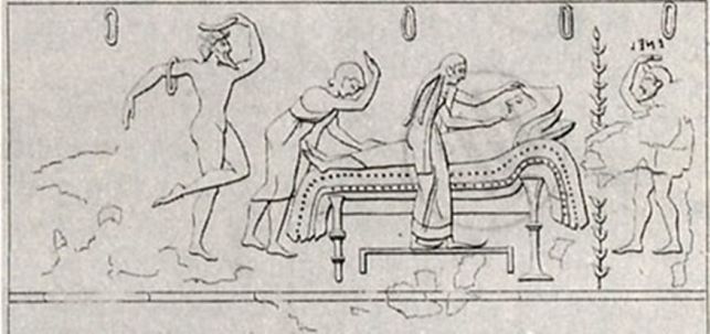 Lo schema iconografico della prothesis che si ritrova nella produzione figurativa etrusca arcaica (cippi, urnette cinerarie e pitture tombali) trae spunto da quello contenuto nella ceramica attica a figure nere della seconda metà del VI secolo a.C. e dei primi del V secolo a.C.