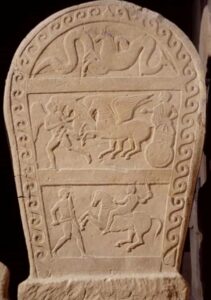Dalla necropoli della Certosa di Bologna proviene la stele a ferro di cavallo n 168 del V secolo a.C. Nei primi due registri vi sono un combattimento tra mostri ed il viaggio all’aldilà su carro trainato da un cavallo alato. Nel terzo registro secondo l’interpretazione prevalente un cavaliere etrusco abbigliato con corazza (forse il defunto) fronteggia un guerriero gallo appiedato nudo ed equipaggiato con scudo ovale ad umbone e spina ed armato con spada a doppio tagliente.
