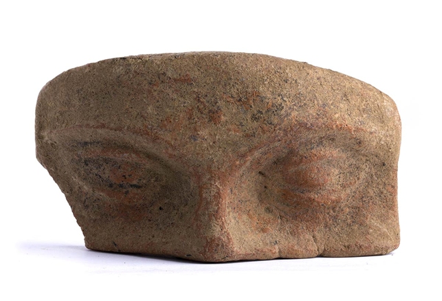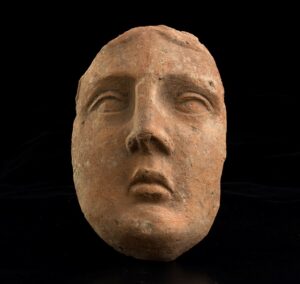 Il frammento di una maschera con bordo superiore curvilineo è stato ritrovato negli scavi del santuario di Punta della Vipera nei pressi di Santa Marinella (l’antica Punicum, porto di Caere).