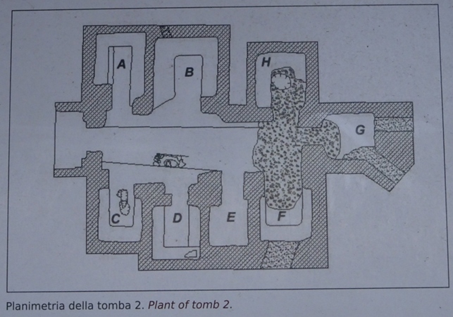 La tomba principale (la 2) è un vero e proprio ipogeo monumentale (realizzato attorno al VI secolo a.C.) della lunghezza di 18 metri: sul corridoio centrale (che è ornato da modanature sul soffitto) si aprono ben otto camere quadrate, con soffitti a capanna, munite di banchine per la deposizione dei defunti. Le caratteristiche della tomba (dimensioni e dettagli architettonici) fanno pensare all’utilizzo della stessa da parte di una potente famiglia della locale aristocrazia terriera. Le tombe a camera risultano scavate attorno alla tomba principale quasi a sottolineare la loro subordinazione verso la famiglia proprietaria del grande ipogeo.