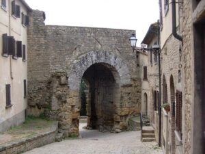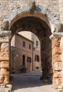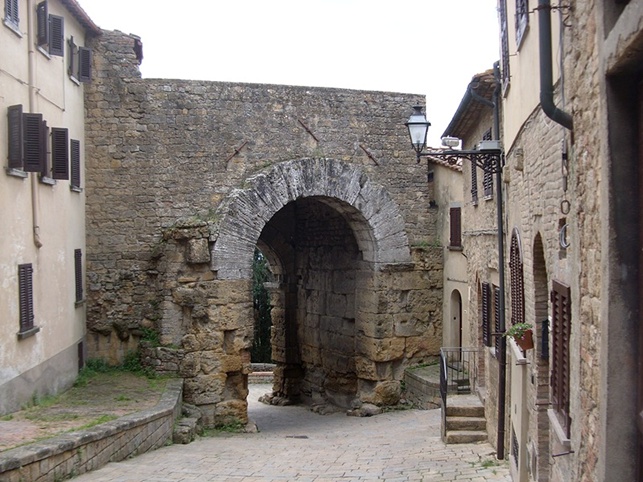 Di origine etrusca è databile al IV secolo a.C.; fu modificata successivamente dai Romani e nel Medioevo. Le parti laterali della porta dovrebbero essere state costruite nel IV secolo a.C., le volte (l’arco e le protomi) probabilmente nel III – II secolo a.C.