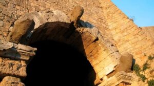 La porta dell’Arco (larghezza m 4,16; altezza m. 7,50; lunghezza m 8,16) – orientata a Sud ed opposta alla Porta Diana (Portone, secondo la denominazione più antica) a Nord – era inserita nella cerchia delle mura etrusche in panchino della città.