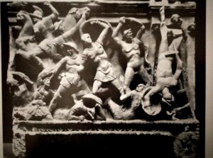 Un’urna volterrana esposta nel Museo Guarnacci (del I secolo a.C.) raffigura una scena di assedio avanti ad una porta con tre teste; probabilmente si tratta della più antica rappresentazione della Porta dell’Arco.