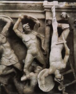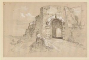 Di seguito le immagini del monumento, dell’urna cineraria volterrana del I secolo a.C. con riproduzione della Porta con le teste e del disegno della Porta di James Ainsley (del 1843).