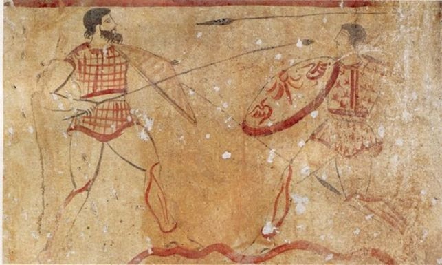Per completezza si precisa che secondo un’altra tesi i duelli tra gladiatori potrebbero invece avere origine osco – sannita ed essersi diffusi a Roma attraverso la Campania, come sarebbe dimostrato in particolare da vasi e pitture tombali di Paestum del IV – III secolo a.C.