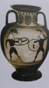 Su di un’anfora a figure nere da Vulci del V secolo a.C. ritrovata a Chiusi – esposta nel Museo Archeologico Nazionale di Firenze – sono rappresentati su un lato due guerrieri con panoplia che si affrontano con la lancia; che possa trattarsi di un ludo gladiatorio sembrerebbe confermato dalla scena di due pugili in lotta riportata sull’altro lato (in questo senso Maurizio Martinelli). Un’altra anfora, sempre a figure nere del V secolo a.C. – conservata nel museo di Karslube – presenta su di un lato due guerrieri che combattono tra loro con scudo, mentre dall’altro lato vi è un Phersu che danza al suono del doppio flauto munito di scudo