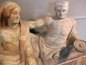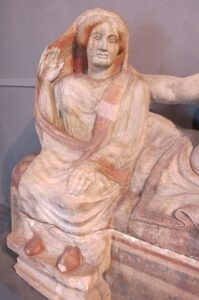 La scena conferma l’importanza della famiglia e la rilevanza sociale della donna in Etruria. Nel contempo l’atteggiamento composto e riguardoso della moglie nell’iconografia del periodo (si consideri ad es. anche la rappresentazione nella Tomba degli Scudi di Tarquinia di Velia Seithiti, modestamente seduta ai piedi del letto a fianco di Larth Velcha) risente forse dell’influsso greco.