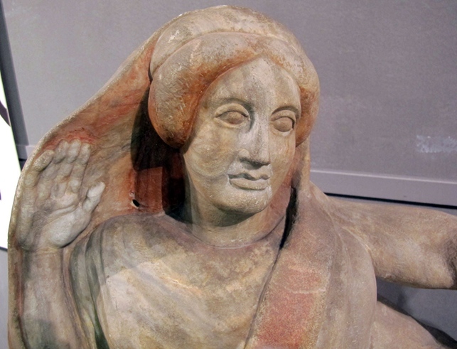 Sul coperchio è rappresentata la coppia coniugale nell’atteggiamento del simposio: l’uomo, in posizione recumbente sulla kline, tiene con la sinistra una patera ed appoggia affettuosamente la mano destra sulla schiena della moglie; la compagna, velata e nell’atto di scostare il velo, siede ai piedi del letto, accanto al marito e poggia i piedi su un panchetto. I due fori visibili ai lati del collo della figura femminile fanno supporre l’originaria applicazione di una collana.