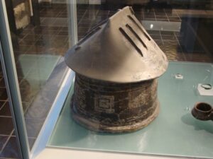 I modelli di Vetulonia sono d’impasto e sono caratterizzati da pianta circolare con zoccolo di base, porta rettangolare sulla fronte e portello con chiusura interna e decorazione applicata a lamelle. Il tetto è testudinato con gronda aggettante con forellini da cui pendevano anellini di bronzo od altri ornamenti. La copertura presenta travi laterali che si incrociano sulla sommità, talvolta terminanti con protome ornitomorfe ed aperture sulle fronti del tetto chiuse da elementi mobili in impasto.