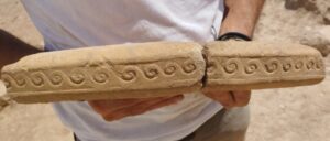 Le ricerche dell’Università del Salento, iniziate lo scorso luglio grazie anche alla disponibilità del proprietario del terreno, Giovanni Botrugno, che ha consentito l’ampliamento dello scavo, stanno mettendo in luce un’area straordinaria, nella quale è emersa una stanza pavimentata con cinque lastre di enormi dimensioni con decorazioni geometriche a rilievo, probabilmente pertinenti ad un recinto rituale, che non trova immediati confronti negli altri siti messapici indagati.