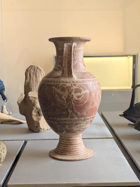 Sul vaso della collezione milanese, datato al 630 a.C. circa, compare una figura di sirena con corpo di uccello ad ali spiegate. Accanto, invece, è raffigurata una nave: la scena richiama l’episodio del libro XII dell’Odissea, in cui si racconta dell’incontro di Ulisse con le Sirene.