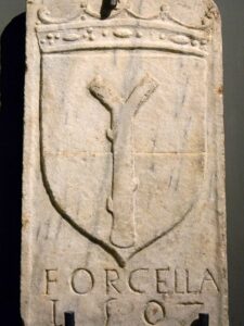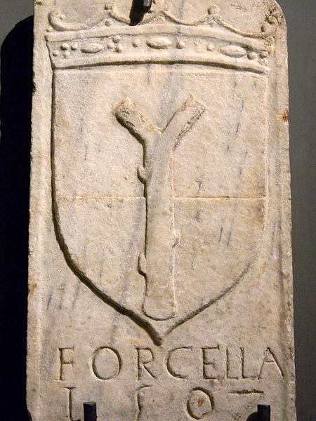 Le origini del nome del quartiere oggi conosciuto come Forcella, non è ancora chiaro, dal libro “I sedili di Napoli” di Luigi de Lutio di Catelguidone, vengono esaminati i sedili della città, analogamente detti stemmi (2); dal testo si evince che i seggi maggiori della città fossero il seggio di Capuano ed il seggio di Forcella, quest’ultimo risalente al XIII secolo era costituito da uno scudo troncato d’oro e di rosso con al centro una Y in nero. Successivamente il seggio di Forcella venne incorporato dal sedile di Montagna, ma in piazza san Lorenzo Maggiore il simbolo a Y di Forcella si può ancora intravedere.