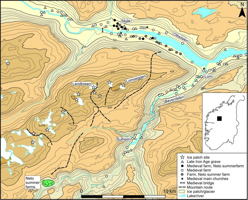 Il progressivo scioglimento dei ghiacci norvegesi ha portato negli ultimi decenni al riemergere di antichi reperti, risalenti a diverse epoche storiche. Un “mistero” che ha in particolare affascinato gli archeologi è quello del passo di Lendbreen. Un antico passo di montagna, localizzato a 1900 metri di quota nelle Jotunheim Mountains, circa 300 Km a Nord-Ovest di Oslo, di cui si è persa nei secoli memoria, utilizzato secondo quanto raccontano i reperti, dal 300 d.C. al 1500 d.C., ovvero dal periodo noto in Scandinavia come Età del Ferro romana al tardo Medioevo.