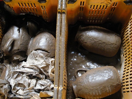 Le cassette dei reperti trasportate dall’acqua hanno vagato per tutto il grande edificio, finendo per giacere in situazione molto caotica, in svariati casi piene di acqua e/o fango; parte dei reperti fuoriusciti da esse sono finiti nel fango sul pavimento. Le grandi casse dei relitti, e soprattutto il loro contenuto, per fortuna non pongono problemi al di là del loro riordino.