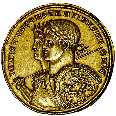 Anche l’imperatore Costantino era un seguace del Dio Sole, in qualità di Pontifex Maximus dei romani. Egli, infatti, raffigurò il Sol Invictus sulla sua monetazione ufficiale, con l’iscrizione SOLI INVICTO COMITI, “Al compagno Sole Invitto”, definendo quindi il Dio come un compagno dell’imperatore.