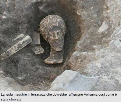 Trovata la testa del Dio degli Etruschi, Voltumna, il capo delle divinità dell’antico popolo. Nuovi eccezionali ritrovamenti archeologici a Orvieto nell’area del Fanum Voltumnae, il grande e mitico santuario federale degli Etruschi risalente al VI sec. avanti Cristo. Alla luce anche il tempio principale e la strada sacra. Ne da notizia la direttrice degli scavi, l’archeologa Simonetta Stopponi dell’Università di Perugia.