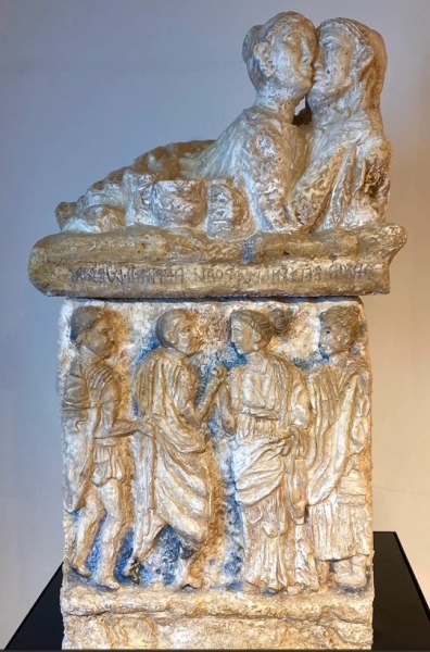 Questa urna di travertino, conservata nel chiostro del Museo Archeologico Nazionale dell’Umbria (e in copia di polistirolo all’Antiquarium), doveva legarsi a una committenza aristocratica. Lo confermano la fattura squisita (addirittura policroma), e il corredo altrettanto raffinato. La sua peculiarità è la decorazione, sul coperchio, e con il bassorilievo inciso sul fronte della cassetta. Il primo è scolpito con la rarissima scena di un tenero bacio tra marito e moglie: i due, allungati secondo l’uso del banchetto romano, si scambiano l’ultimo saluto d’addio.