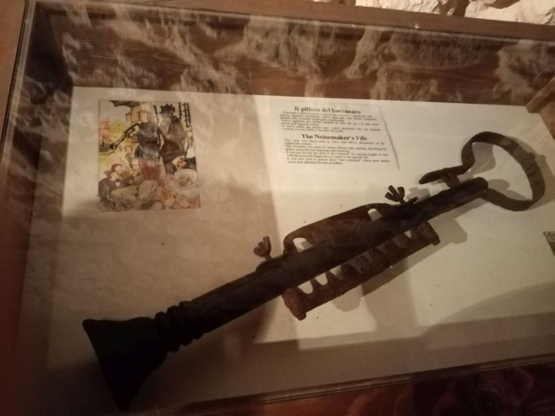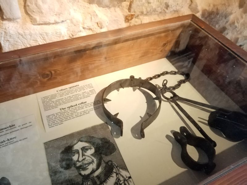 Oltre a due degli strumenti di tortura più conosciuti, quali l’accetta per la decapitazione e la sedia inquisitoria, sono esposte al pubblico strumenti di tortura che coinvolgevano singole parti del corpo e che non portavano necessariamente alla morte del detenuto come il collare spinato (Fig.1) oppure il piffero del baccanaro (Fig.2).