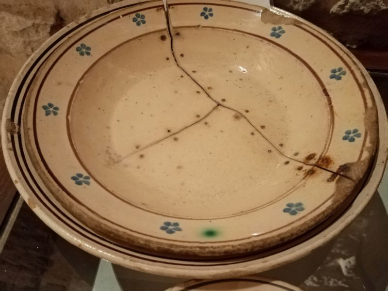 Al termine del percorso guidato nelle stanze, il castello offre una piacevole sorpresa; nell’ultima stanza infatti si possono apprezzare alcuni oggetti di uso quotidiano del nostro recente passato quali: un’antica sella; un telaio; piatti (Fig.3) testimoni di un antico mestiere ormai perduto, quello del sanapiatti (costui provvedeva a rimettere insieme i cocci utilizzando un filo di ferro e collanti naturali, il suo compenso non era in denaro bensì in natura, accontentandosi di un tozzo di pane).