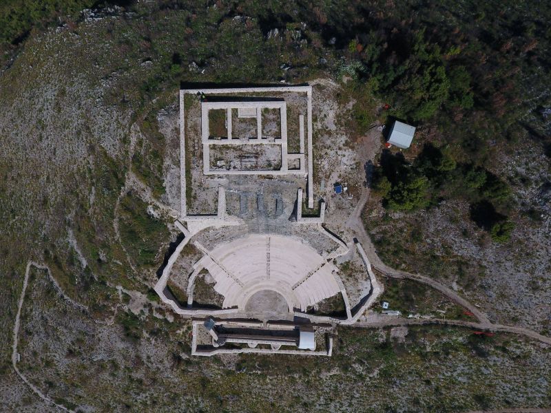 Del teatro, posto a una ventina di metri più in basso, si conservano la cavea semicircolare, ricavata sfruttando il pendio naturale della collina, e la scaena (la struttura dov’era rappresentata la scenografia) situata lungo il margine meridionale della terrazza, rinforzata da quattro torrette.