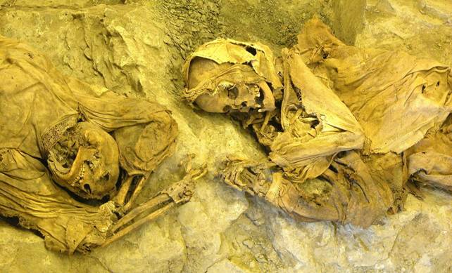 Musealizzazione della sepoltura di due mummie fissate nel rigor mortis: le due salme non sono state ricomposte ma riproposte nella posizione esatta in cui sono state rinvenute, la donna anziana con le mani giunte (a destra) morta nel sonno, la giovane (a sinistra) con braccia contratte dal dolore sopra la testa