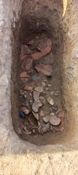 Quindi i recipienti offertoriali e altri oggetti di ceramica che stavano davanti o dentro le vecchie tombe furono, dagli operai impegnati in quell’antichissima ristrutturazione, rimossi. Venne poi scavata una buca – che per ora si rivela con una forma di T – e lì depositati e sepolti.