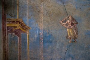 Ora siamo a parlare di un’ulteriore scoperta, ancora una volta proprio nell’insula 10 della Regio IX, dove gli scavi proseguono e hanno restituito di recente un ambiente interpretabile come Sacrario, con pareti a fondo azzurro (raramente utilizzato a Pompei, attribuibili al IV Stile e decorate con figure femminili rappresentanti le stagioni (Horae), nonché due allegorie, dell’agricoltura e della pastorizia, come indicano i rispettivi attributi, l’aratro per la prima figura e il pedum – un corto bastone usato da pastori e cacciatori – per la seconda.