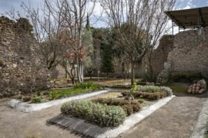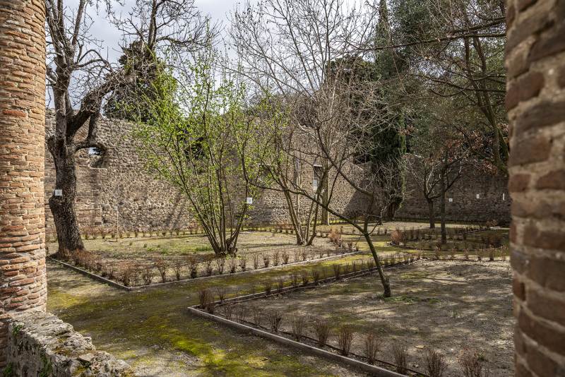 La casa presentava una zona residenziale nella parte nord-orientale della struttura, mentre a sud vi era un grande giardino che ospita l’Orto Botanico, che oggi le dà il nome. Si tratta di un’area verde di oltre 800 mq dove sono raccolte un insieme di specie rappresentative che venivano coltivate già nella città antica: alberi da frutta, piante sacre, medicinali, orticole. Viene riproposta la quartatura in Ars topiaria, disegno presente nel secolo scorso con la sostituzione delle siepi a mirto con piante di melograno nano. Nel secondo giardino sono presenti aiuole con metodi di coltivo arcaico (spallettature rinforzate e olle pertuse), specie utilizzate sono tinctorie, aromatiche, orticole, officinali.