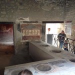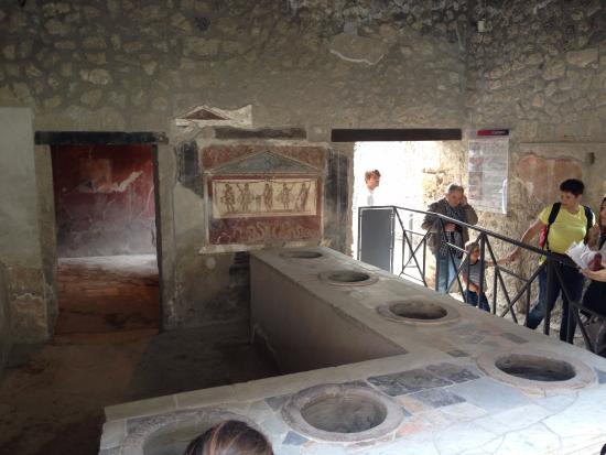 La nuova sistemazione della Fullonica, come ben testimoniato da una foto d’epoca del 1916, riprende fedelmente l’originale allestimento voluto da Vittorio Spinazzola, che scavò la struttura nel 1912. L’allestimento di inizio novecento rispondeva a un criterio didattico, molto moderno per l’epoca, di riproposizione degli spazi al fine di condurre il visitatore a percepire quella che era la vita quotidiana della città antica. Si poteva difatti comprendere il funzionamento e l’organizzazione di una cucina del I sec. d. C. , con la griglia in ferro per la carne ancora appesa alla parete e il vasellame necessario per la preparazione e la cottura degli alimenti disposto sul bancone.
