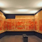 Il Triclinio C, con la personificazione di divinità fluviale (Sarno) in esso raffigurato, su pareti rosse.