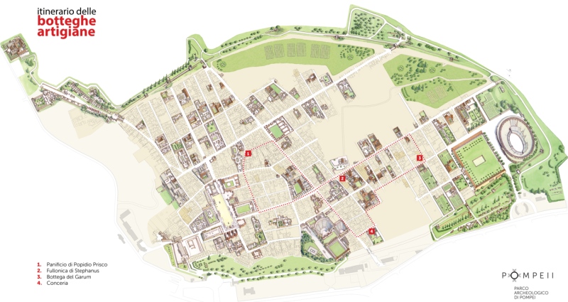 L’apertura della conceria si inserisce nella nuova proposta del Parco archeologico di Pompei, di itinerario delle botteghe artigiane che dal 30 giugno fino al 1 agosto, consentirà di visitare alcuni impianti dedicati ad attività di diverso genere. E dunque oltre alla conceria, la Fullonica (l’antica lavanderia), il Panificio di Popidio Prisco e la Bottega del garum, dove si produceva il prezioso condimento a base di colatura di pesce.