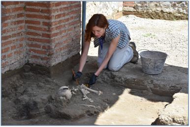 La peculiarità del ritrovamento è che lo scheletro era immerso nel flusso piroclastico (mix di gas e materiale vulcanico). Normalmente nella stratigrafia dell’eruzione del 79 d.C. è presente nel livello più basso il lapillo e poi la cenere che sigilla tutto. In questo caso si doveva trattare di un ambiente chiuso dove il lapillo non è riuscito ad entrare né a provocare il crollo dei tetti, mentre è penetrato direttamente il flusso piroclastico dalle finestre, nella fase finale dell’eruzione.