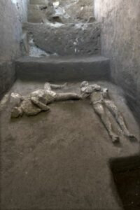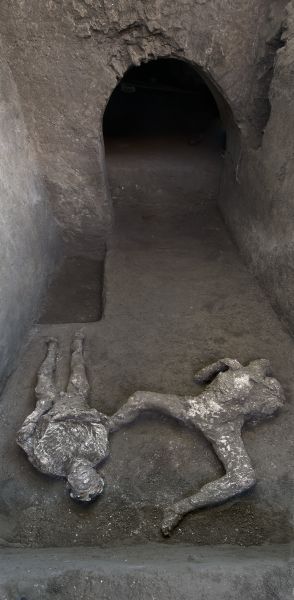 Durante la prima fase eruttiva, quando l’antica città romana venne ricoperta dai lapilli, le prime vittime furono quelle intrappolate negli ambienti, investite dai crolli provocati dal materiale vulcanico depositatosi fino a un’altezza di tre metri. Di queste persone sono rimasti soltanto gli scheletri. Poco dopo, quando la città venne colpita dal flusso piroclastico che riempì gli spazi non ancora invasi dai materiali vulcanici, le persone morirono all’istante per shock termico. I corpi rimasero nella posizione in cui erano stati investiti dal flusso, e il materiale cineritico solidificatosi ne ha conservato l’impronta dopo la decomposizione. Proprio questo è successo ai due pompeiani da poco rivenuti nella villa suburbana del Sauro Bardato a Civita Giuliana, dove uno scavo in corso dal 2017 ha riportato alla luce i resti di una lussuosa abitazione che, con una grande terrazza panoramica, dominava il Golfo di Napoli e di Capri.