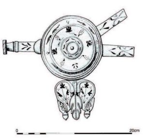 La forma di questi elementi e i confronti in letteratura fanno ipotizzare che appartengano a un tipo particolare di sella definita a quattro corni, formata da una struttura di legno rivestita con quattro corni, due anteriori e due posteriori, ricoperta da placche di bronzo che servivano per dare stabilità al cavaliere, in un periodo in cui non erano state inventate le staffe. Selle di questo tipo sono state utilizzate nel mondo romano a partire dal I secolo d.C. ed in particolare in ambito militare. Le giunzioni ad anello erano quattro per ogni bardatura e servivano a collegare diverse cinghie di cuoio per bloccare la sella sul dorso del cavallo. Si tratta sicuramente di bardature militari da parata.
