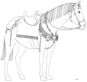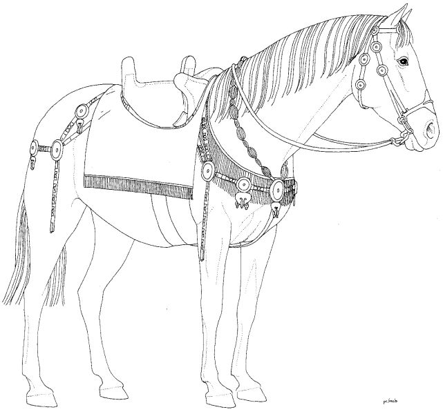 Ulteriori elementi riferibili agli “ornamenta” del cavallo sono documentati dietro la schiena, dove tracce di fibre vegetali lasciano ipotizzare la presenza di un drappo/mantello e nello spazio tra le zampe posteriori ed anteriori, in cui un ulteriore calco suggerisce la presenza di una sacca. E’ probabile che parte dei mancanti finimenti siano stati trafugati dai tombaroli.