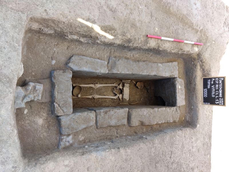 Dell’inumato, probabilmente un adolescente a giudicare dalla lunghezza dello scheletro e dalle dimensioni delle ossa, si conservava perfettamente la parte inferiore, dal bacino ai piedi, mentre quella superiore era stata danneggiata da infiltrazioni di radici e, probabilmente, da animali. Il corredo era costituito da un grande cinturone di bronzo, indossato, e da due coppe a vernice nera collocate ai piedi, di cui una, dotata di anse, è la tipica coppa destinata al consumo del vino (skyphos).