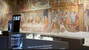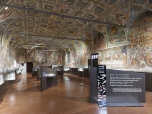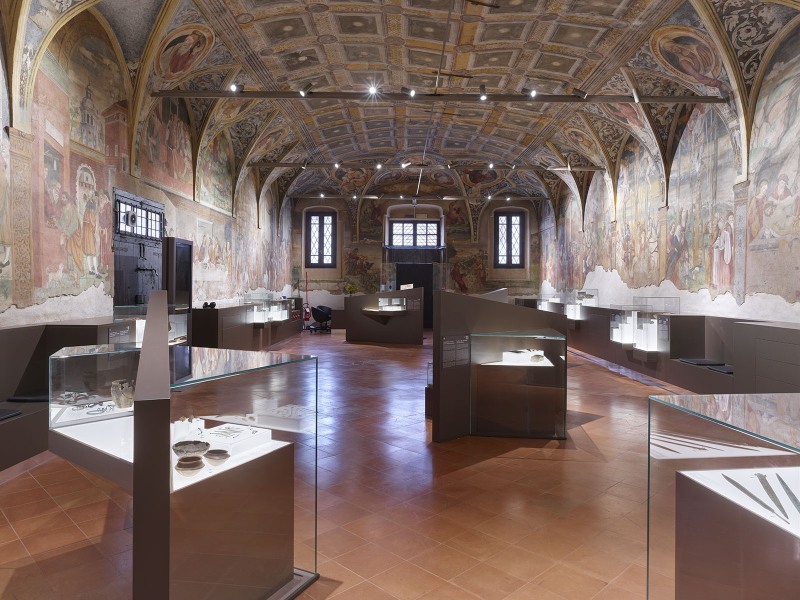 Nella grande sala espositiva, decorata con affreschi del Cinquecento, sono state poi inserite delle sedute che concedono ai visitatori un momento di riposo, e pensando ai più piccoli ci si è tenuti ad un’altezza che consente anche a loro di vedere tutti i reperti e le immagini presenti nello spazio.
