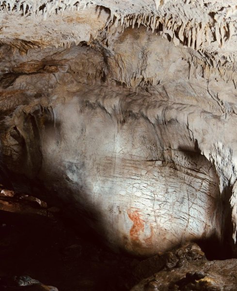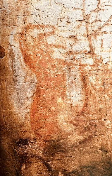 In questo caso non si riesce chiaramente a stabilire se la colorazione bianca suddetta sia artificiale o appartenga a una velo calcareo della parete stessa che sia stato ritagliato, e così pure se il rossiccio delle impronte delle mani non sia piuttosto il colore della patina della roccia sottostante.