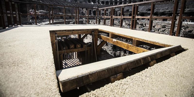 Successivamente vengono creati i sotterranei retti da pilastri che sostituiscono i pali in legno. Il montacarichi, ricostruito dopo un lavoro di progettazione ed esecuzione durato 15 mesi, sulla base dei documenti e in base alle tracce rimaste nelle murature in tufo nel sotterraneo, è opera dall’ingegnere Umberto Baruffaldi della Soprintendenza e prende avvio dagli studi storici e filologici dell’ingegnere Heinz Beste dell’Istituto Archeologico Germanico di Roma e dalle indicazione di Rossella Rea e dell’architetto Barbara Nazzaro responsabili tecnici del monumento. L’operazione di “archeologia sperimentale” nasce per il documentario “Colosseum-Roman death trap”, in cui compare anche un lupo, realizzato dalla “Providence Pictures di Rhode Island”, diretto da Gary Glassman.