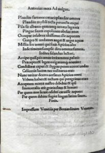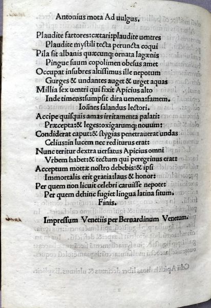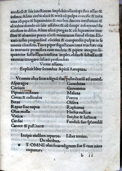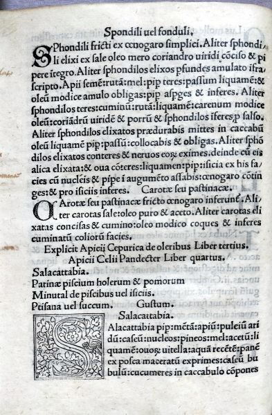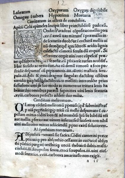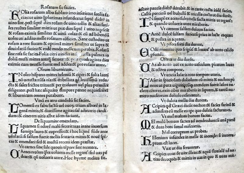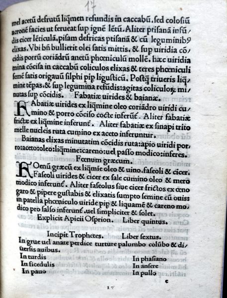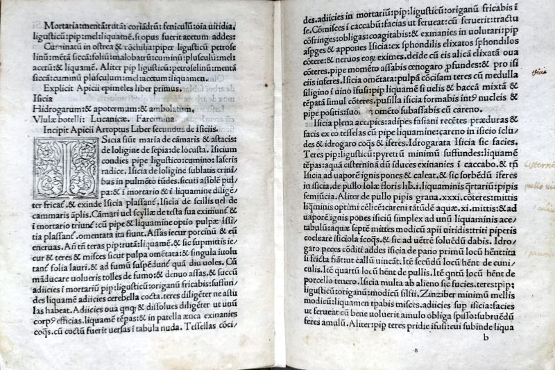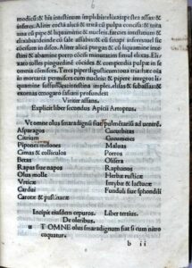 Un prezioso incunabolo stampato attorno al 1500 e conservato alla Biblioteca Vallicelliana è uno dei rari testimoni del più famoso ricettario dell’antichità: il De re coquinaria di Apicio. L’incunabolo (termine con cui si indica un libro stampato a caratteri mobili dalle origini dellastampa fino all’anno 1500) custodito dalla Vallicelliana è uno dei tredici incunaboli del De re coquinaria ancora presenti nelle biblioteche italiane: si tratta della editio princeps, ovvero della prima edizione a stampa di quest’opera, scritta prima che la stampa venisse inventata. In particolare, fu stampata a Venezia dal tipografo di origini albanesi Bernardino Vitali, che fu attivo nella laguna tra il 1493 e il 1539, con anche una parentesi a Roma dal 1508 al 1522. L’incunabolo della Vallicelliana ci ha tramandato il rifacimento del IV secolo, in latino, volgare, del testo originale del I secolo (che non conosciamo: la rielaborazione risalente a tre secoli dopo è l’unico modo per leggere il De re coquinaria).