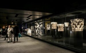 A 20 metri di profondità, la stazione Colosseo è anche un raccordo tra contemporaneità e antichità, con l’esposizione in teche ed ambienti ad hoc dei reperti archeologici recuperati negli scavi: ci sono una domus con affreschi di età imperiale, 28 pozzi di età repubblicana, il balneum di una domus databile tra il I Secolo a.C. e il I Secolo d.C. (e dal corridoio di collegamento tra la Linea C e B si vede il Colosseo dal basso).